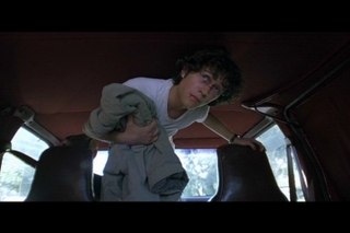 운전하며 가는 총각이 다른 총각을 차에서 내려주곤 백미러로 뒤에서 걸어 오는 걸 보고 있고,